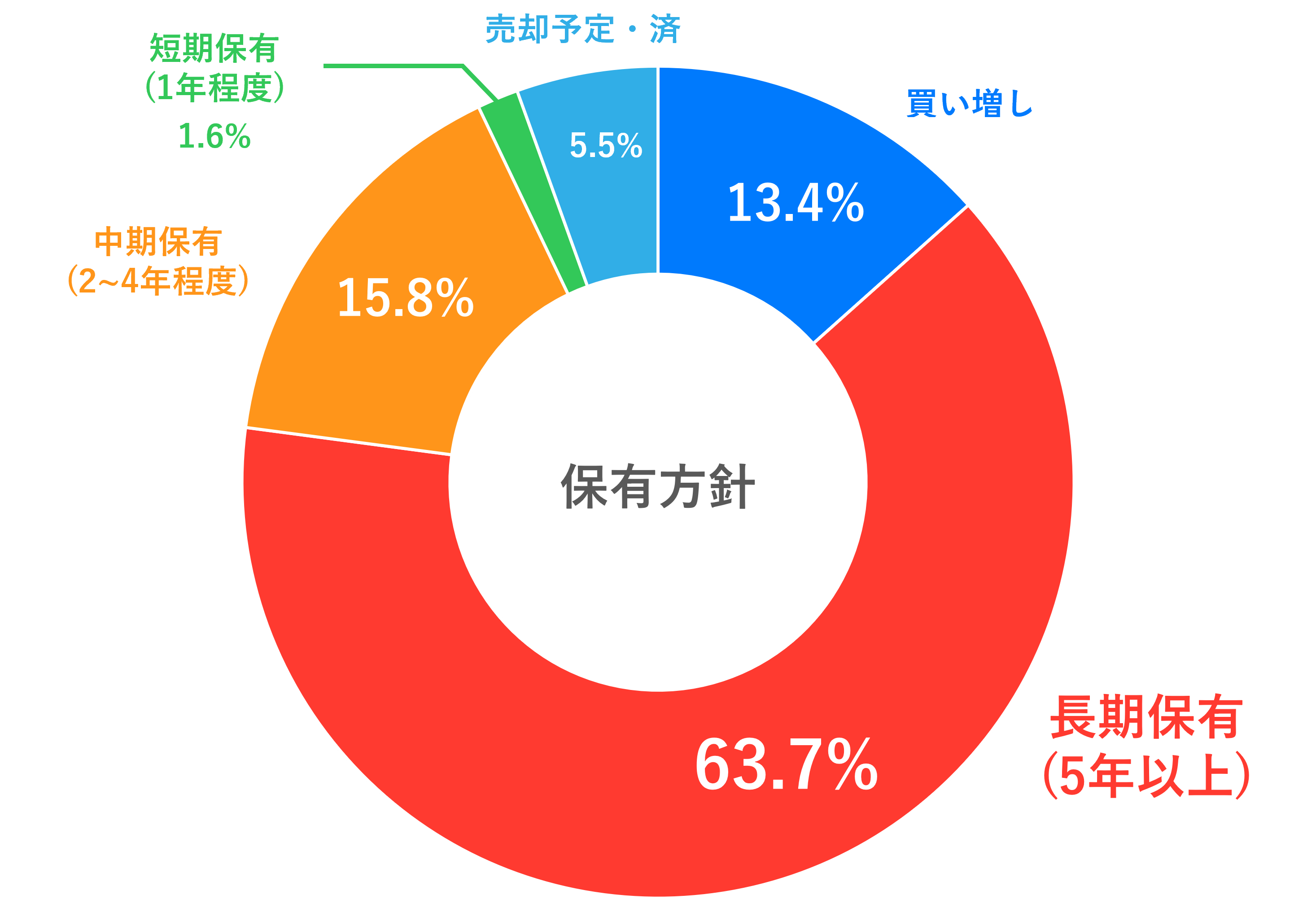 63.7%が長期保有(5年以上)を、15.8%が中期保有(2~4年程度)を、13.4%が買い増しの方針との回答を頂きました。