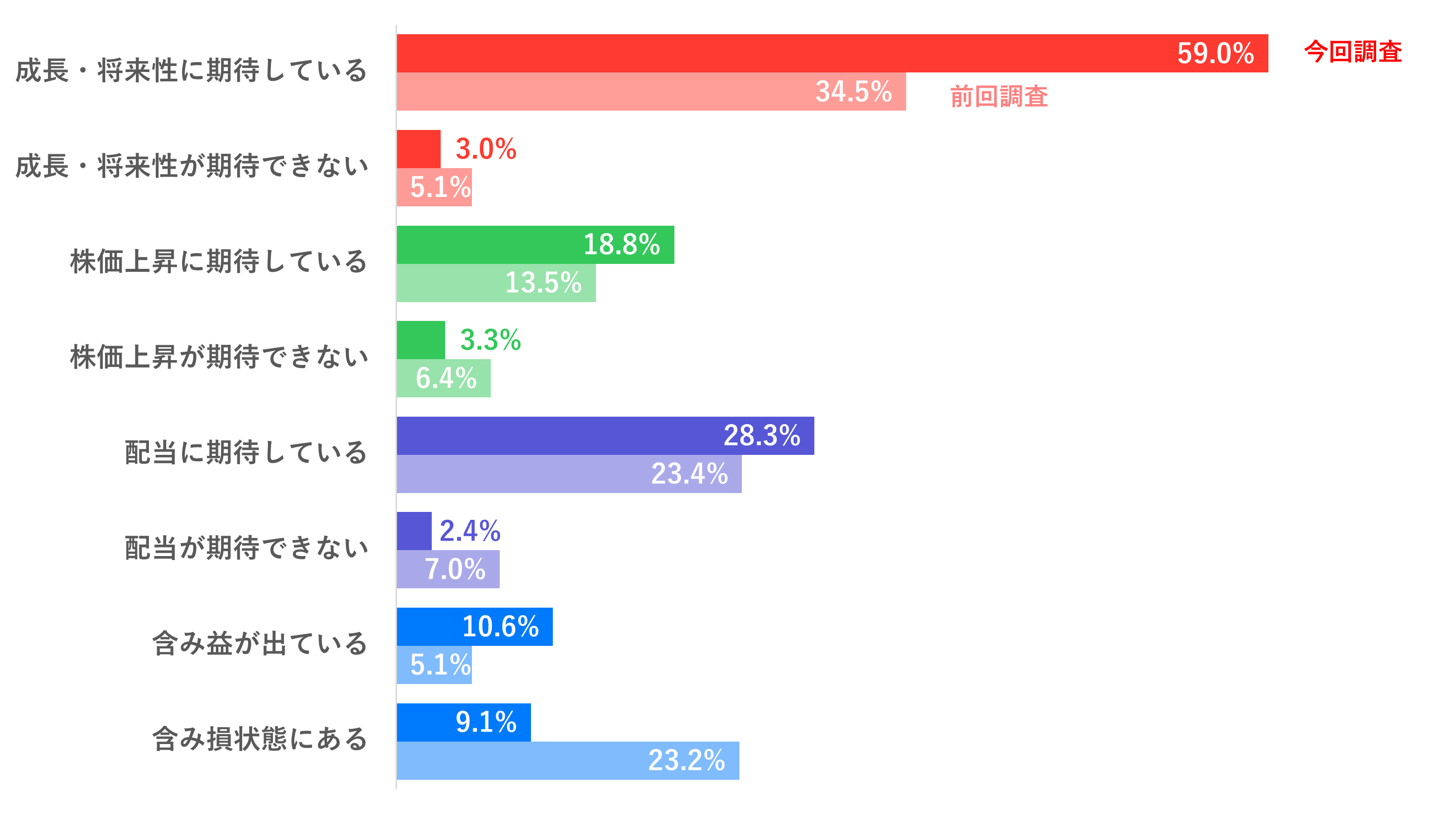 「成長・将来性に期待している」とのご回答が59.0%となり、前回調査(34.5%)から24.5pt上昇しました。